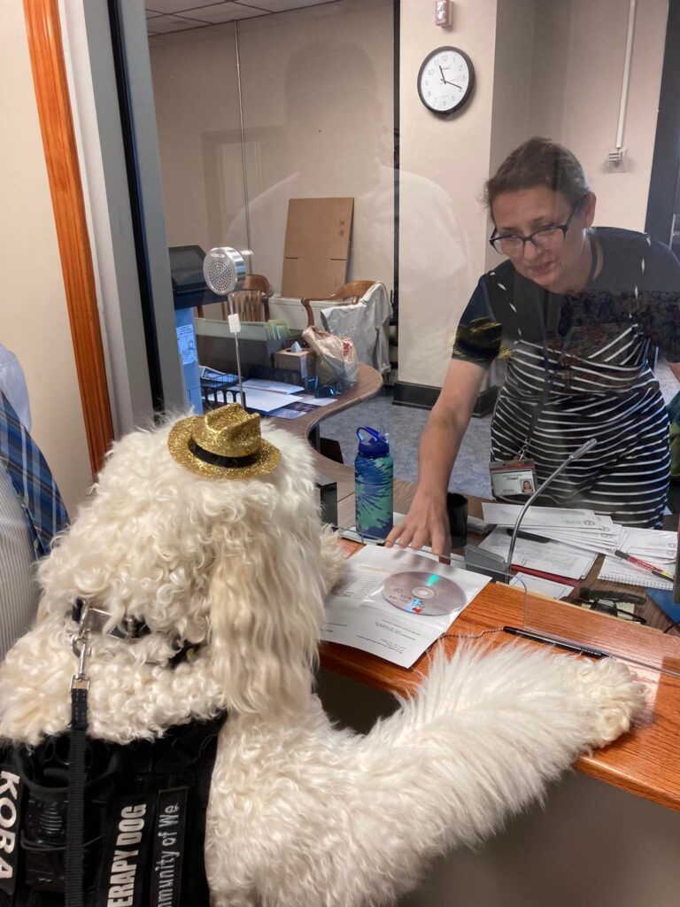 For Kora’s swearing-in ceremony, Erin literally brought six or seven dogs along, all wearing party hats.