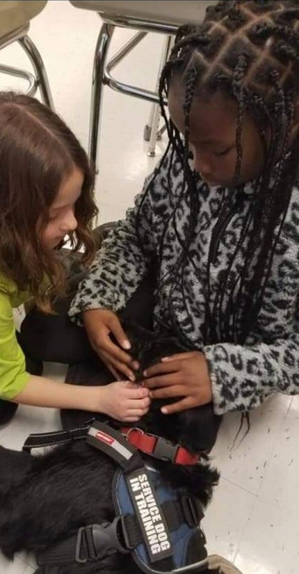 My most favorite thing I have helped Highland Canine Connect with is taking their dogs in to nursing homes and schools! That is the absolute best thing. Yes, it helps the dogs with socialization, but just as importantly, those people in the nursing home light up when they see us coming. They will be waiting at the door for us. It is truly heartwarming. And the students and schools! Oh my goodness! Some of them have never even been around a dog but will rush to get to pet one. The students read to the dogs in small groups. The dogs will be in a down/stay position. Five or six kids will read a short book. The program was designed to help children with their reading skills. It is awesome! Even though the kids are having to read, they love it.